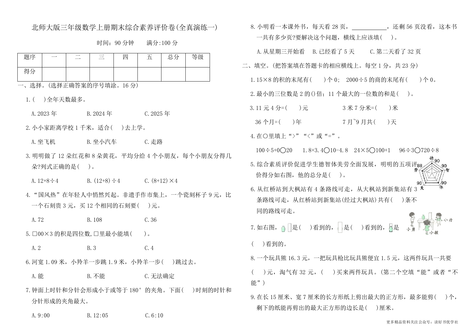 期末综合素养评价卷(全真演练一)(含答案)北师大版三上数学