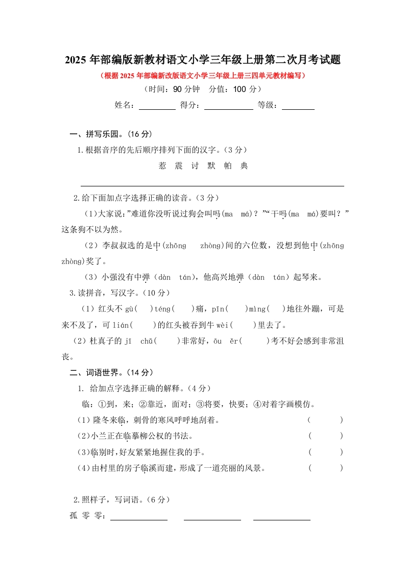 首页三年级语文上册25年三上语文第二次月考试题(有答案)