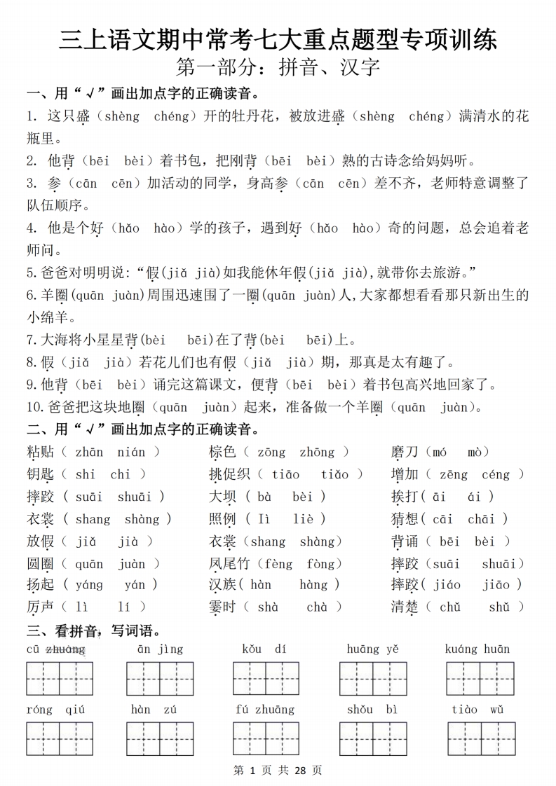 首页三年级语文上册新三上语文期中常考七大重点题型专项训练(含答案28页)(1)