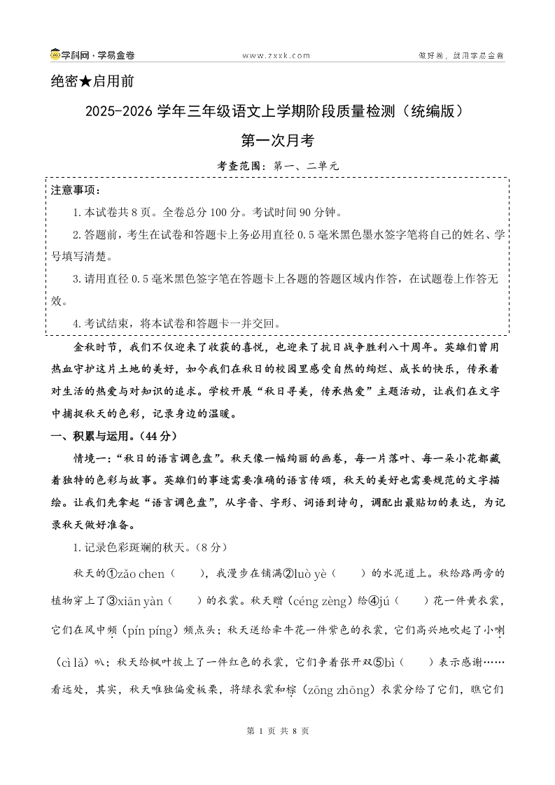 首页三年级语文上册第一次月考(第一二单元)(考试版A4)语文三上