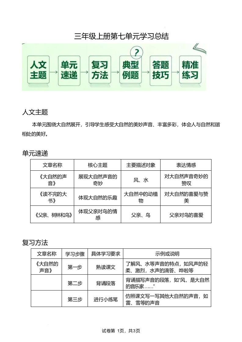 阅读复习 第七单元(期末专项训练)三年级语文上学期(统编版·新教材)