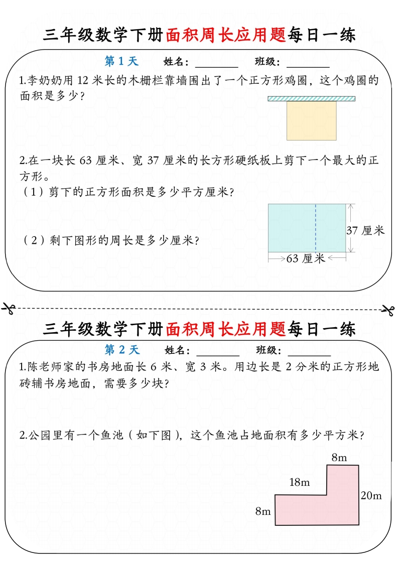 三年级(下)数学 《面积周长应用题》每日一练小纸条