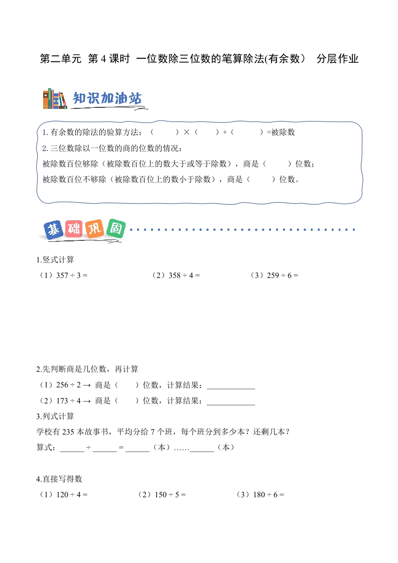 第二单元 第04课时 一位数除三位数的笔算除法(有余数)(分层作业)数学人教版三年级下册(新教材)