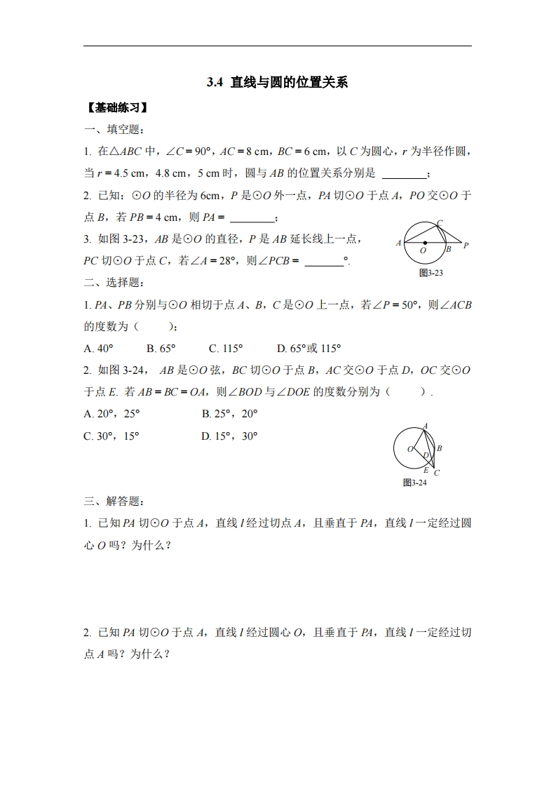 九年级(上)数学《直线与圆的位置关系》同步练习1(青岛版)