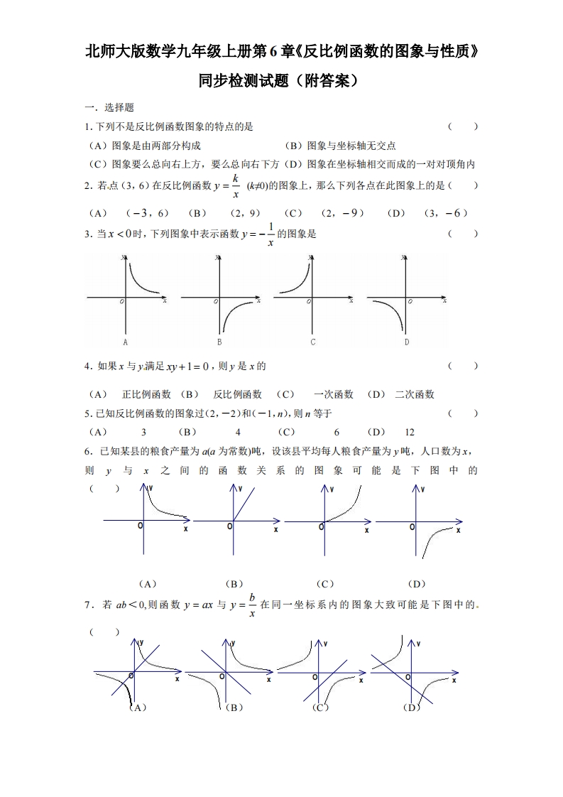首页九年级数学上册九年级(上)数学反比例函数的图象与性质同步检测试题《北师大版》
