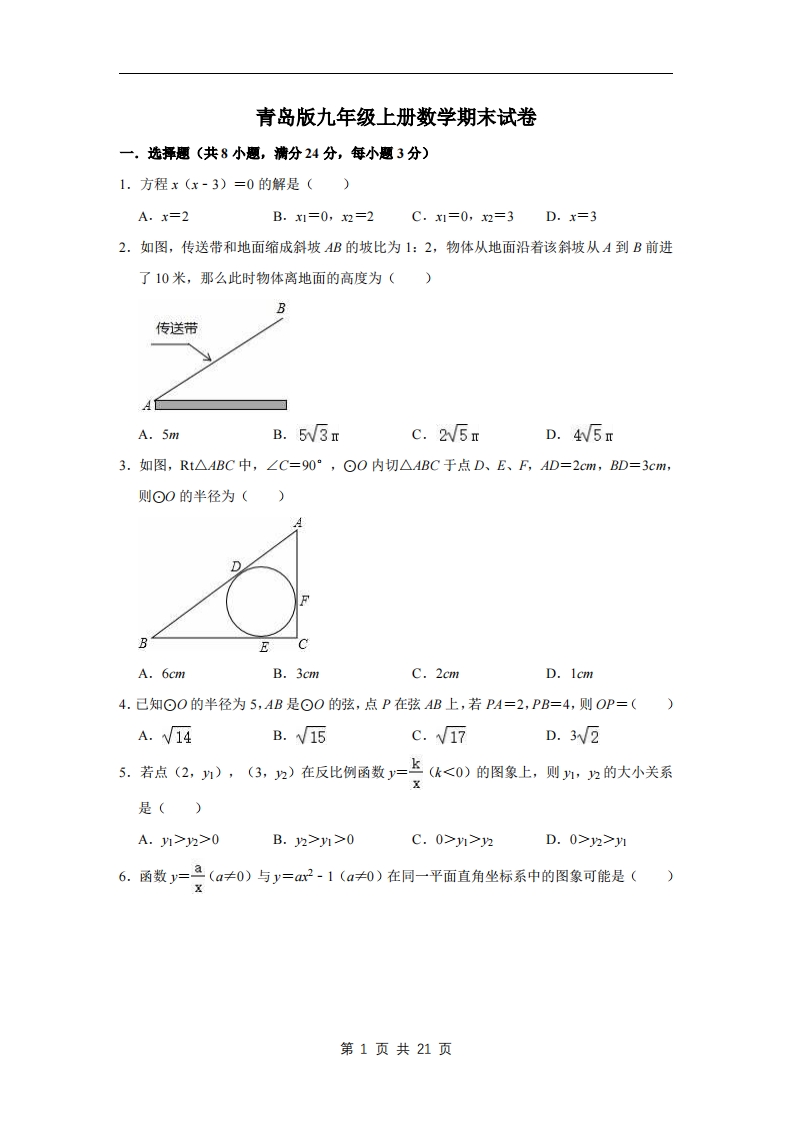 首页九年级数学上册九年级(上)数学期末试卷 (1)(青岛版)