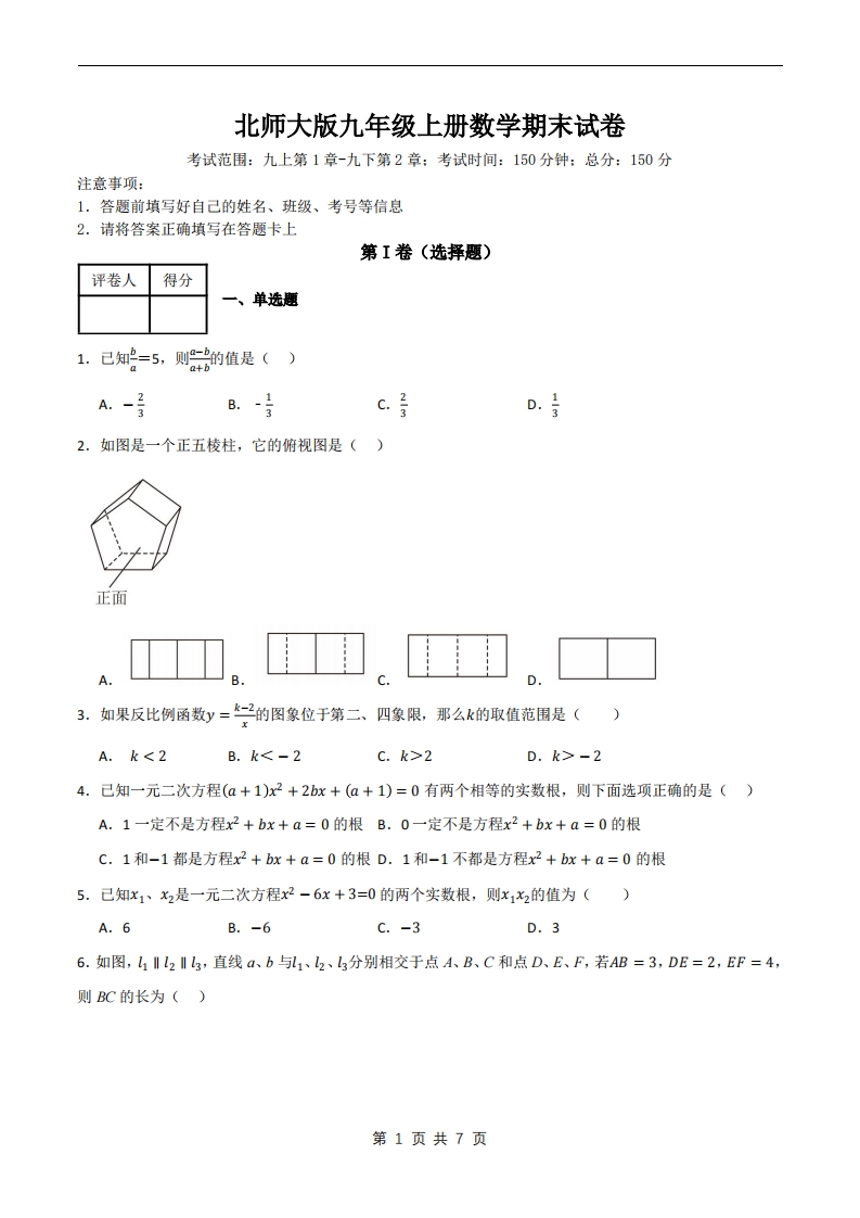 首页九年级数学上册九年级(上)数学期末试卷原卷《北师大版》