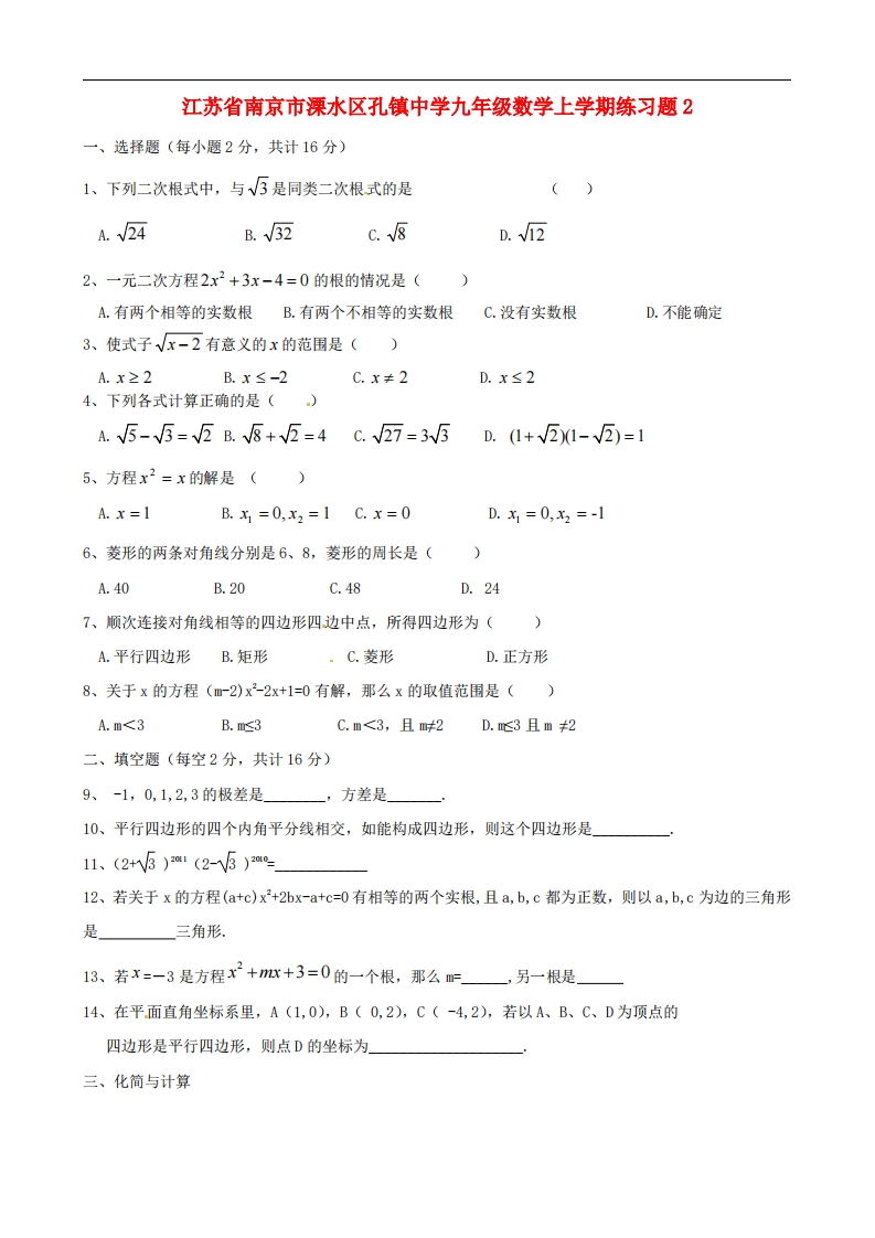 首页九年级数学上册九年级(上)数学上学期练习题2 (苏科版)