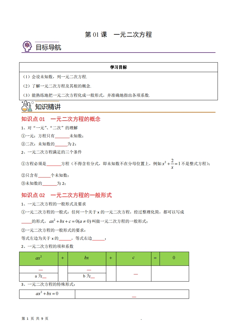 九年级(上)数学一元一次方程同步讲义(人教版)