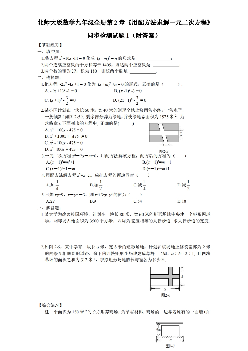 首页九年级数学上册九年级(上)数学用配方法求解一元二次方程同步检测试题(北师大版)