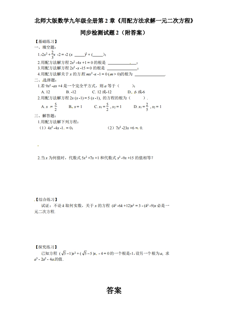 首页九年级数学上册九年级(上)数学用配方法求解一元二次方程同步检测试题2(北师大版)