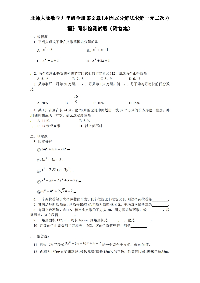 首页九年级数学上册九年级(上)数学用因式分解法求解一元二次方程同步检测试题(北师大版)