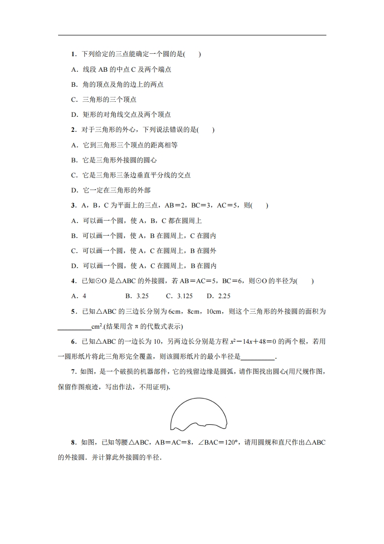 九年级(上)数学第28章专题练习3 过三点的圆1(冀教版)