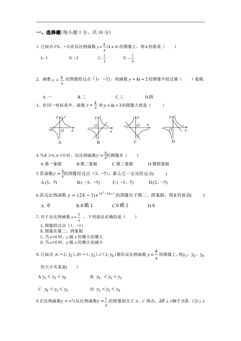 九年级(上)数学第二十七章 反比例函数2(1)(冀教版)