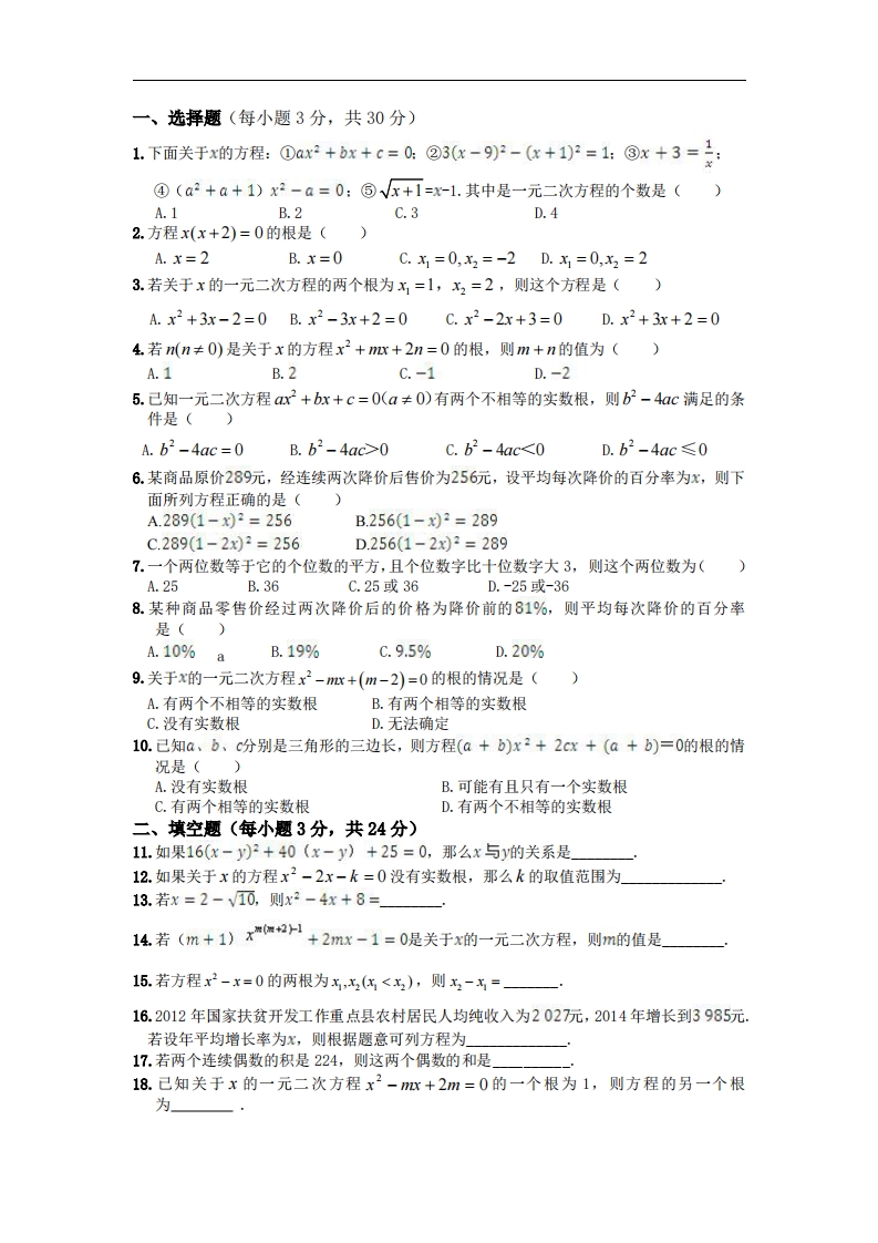 九年级(上)数学第二十四章 一元二次方程(冀教版)