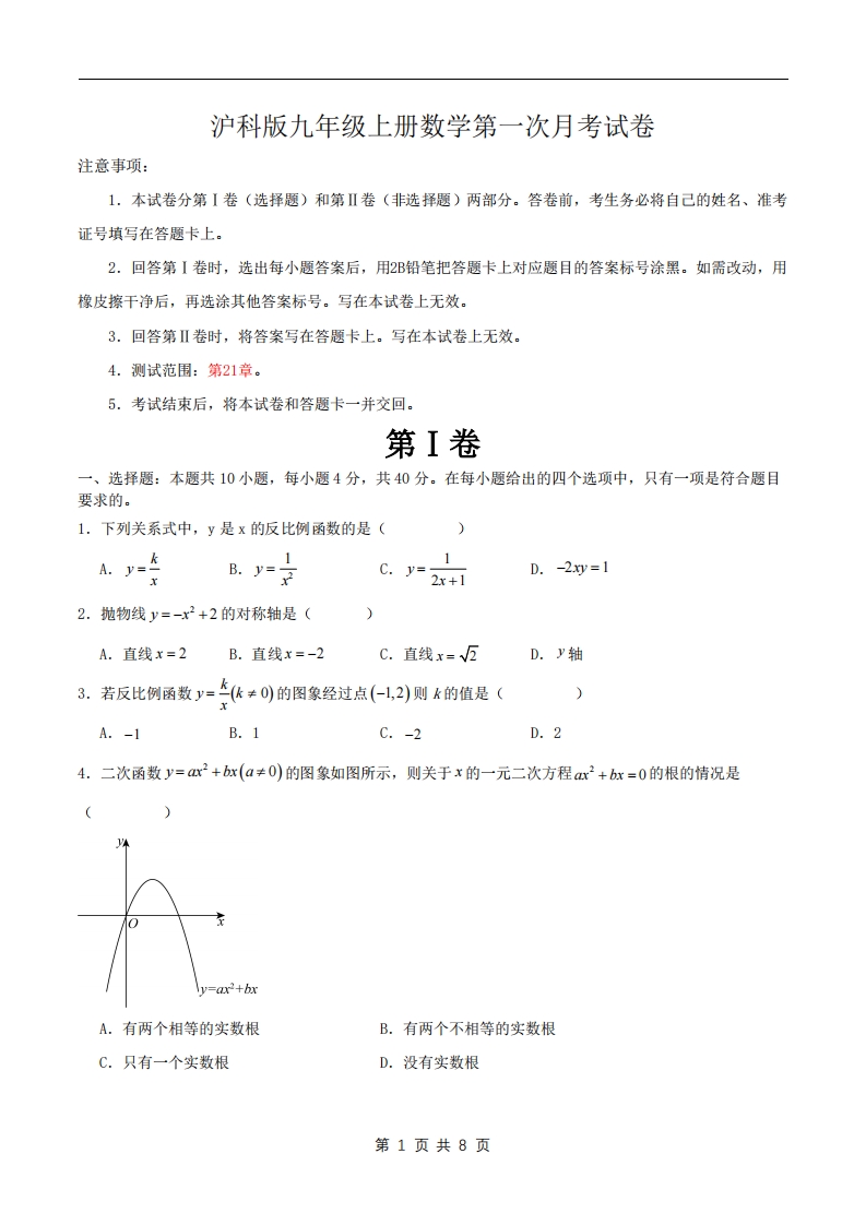 九年级(上)数学第一次月考卷1(沪科版)