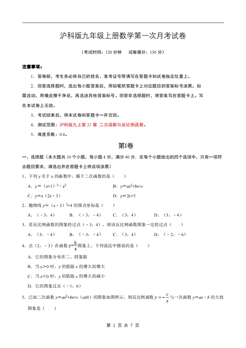 九年级(上)数学第一次月考卷2(沪科版)