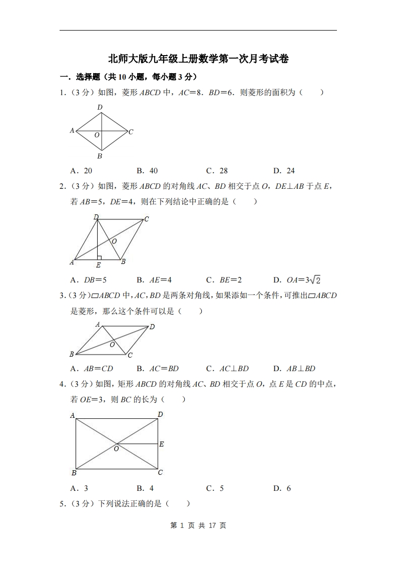 九年级(上)数学第一次月考试卷1(北师大版)