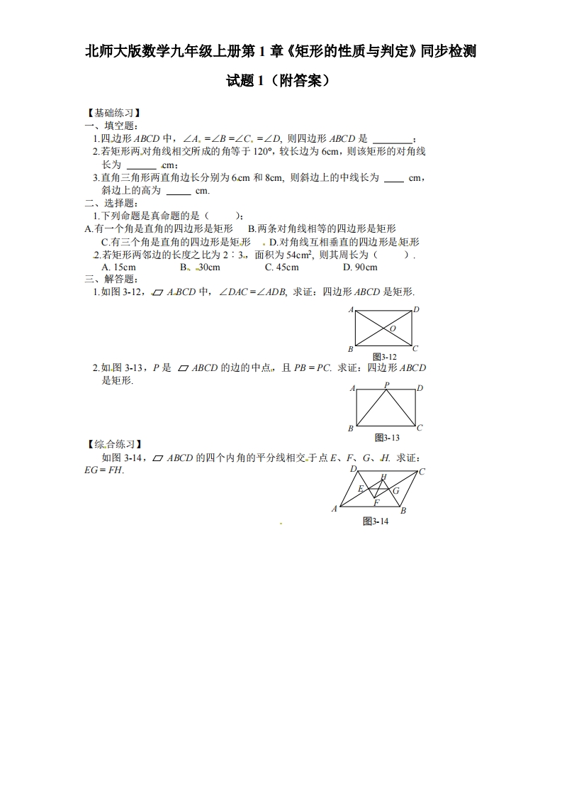 九年级(上)数学矩形的性质与判定同步检测试题1(北师大版)