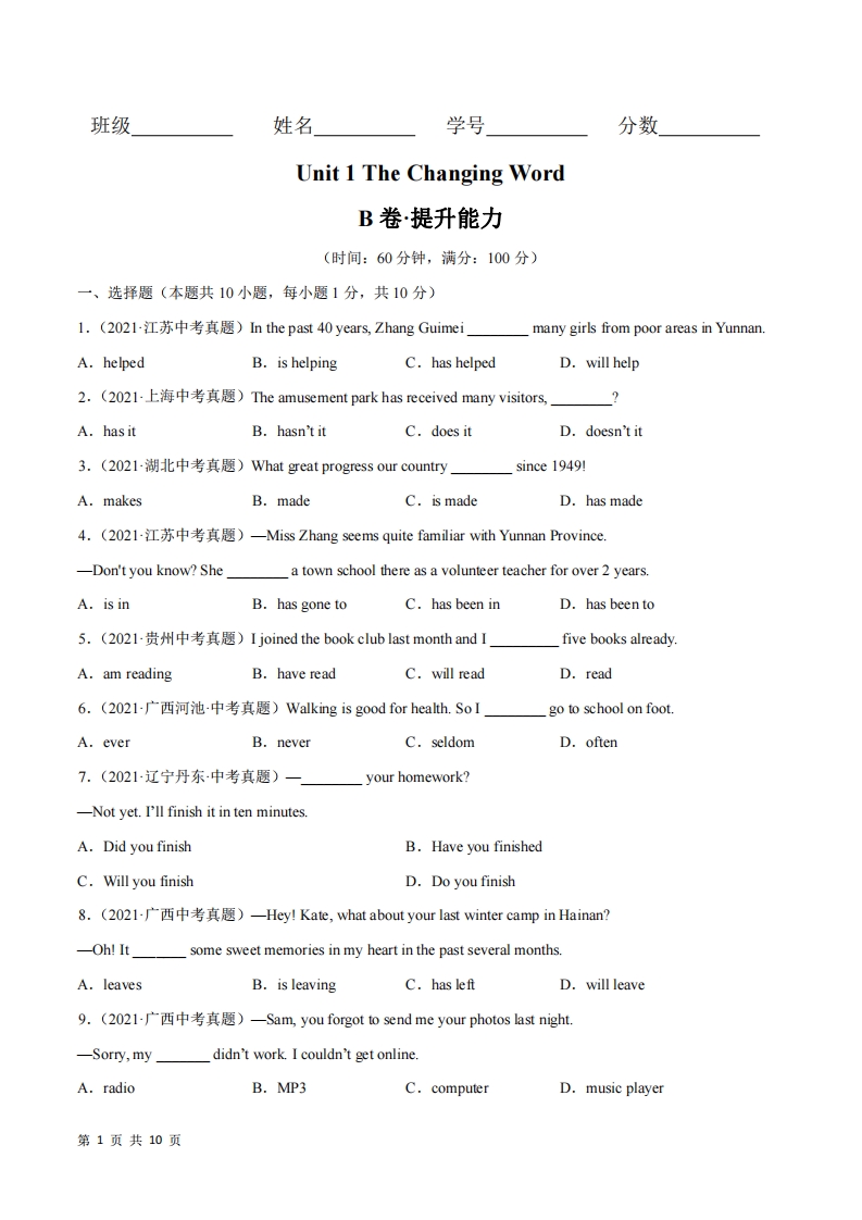 九年级(上)英语 Unit 1 B卷能力提升(仁爱版)