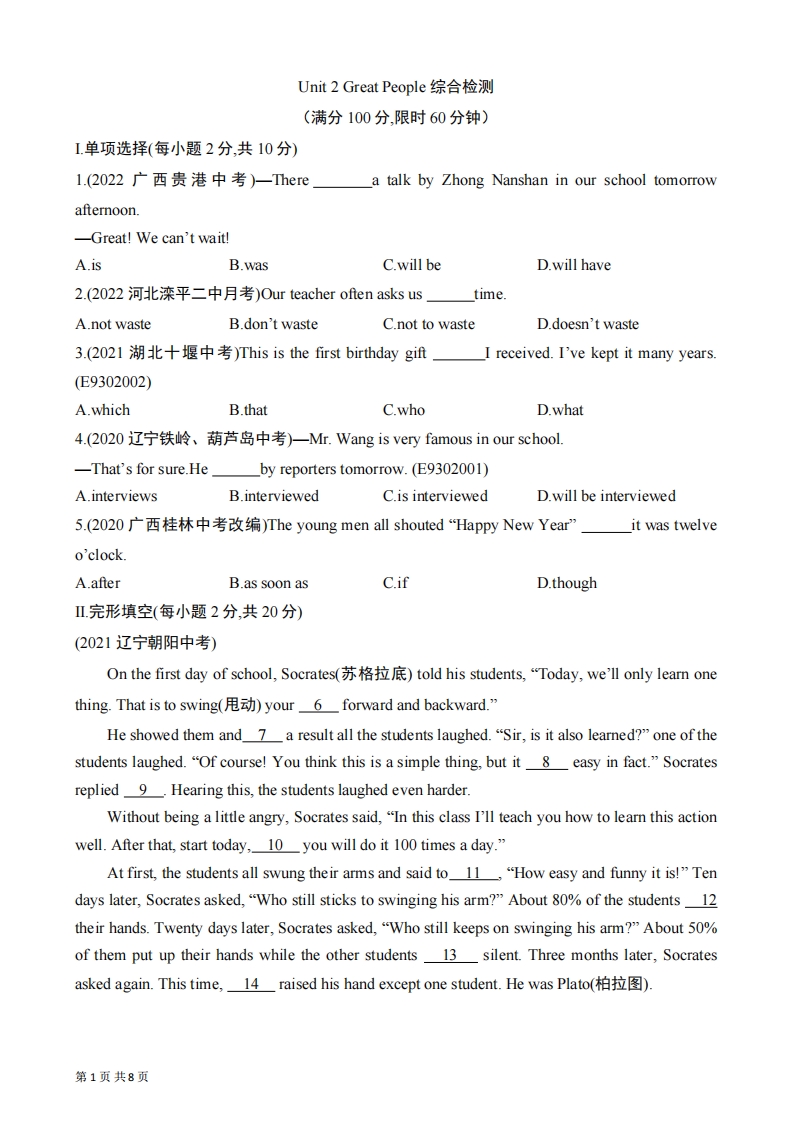 首页九年级英语上册九年级(上)英语 Unit 2 综合检测(冀教版)