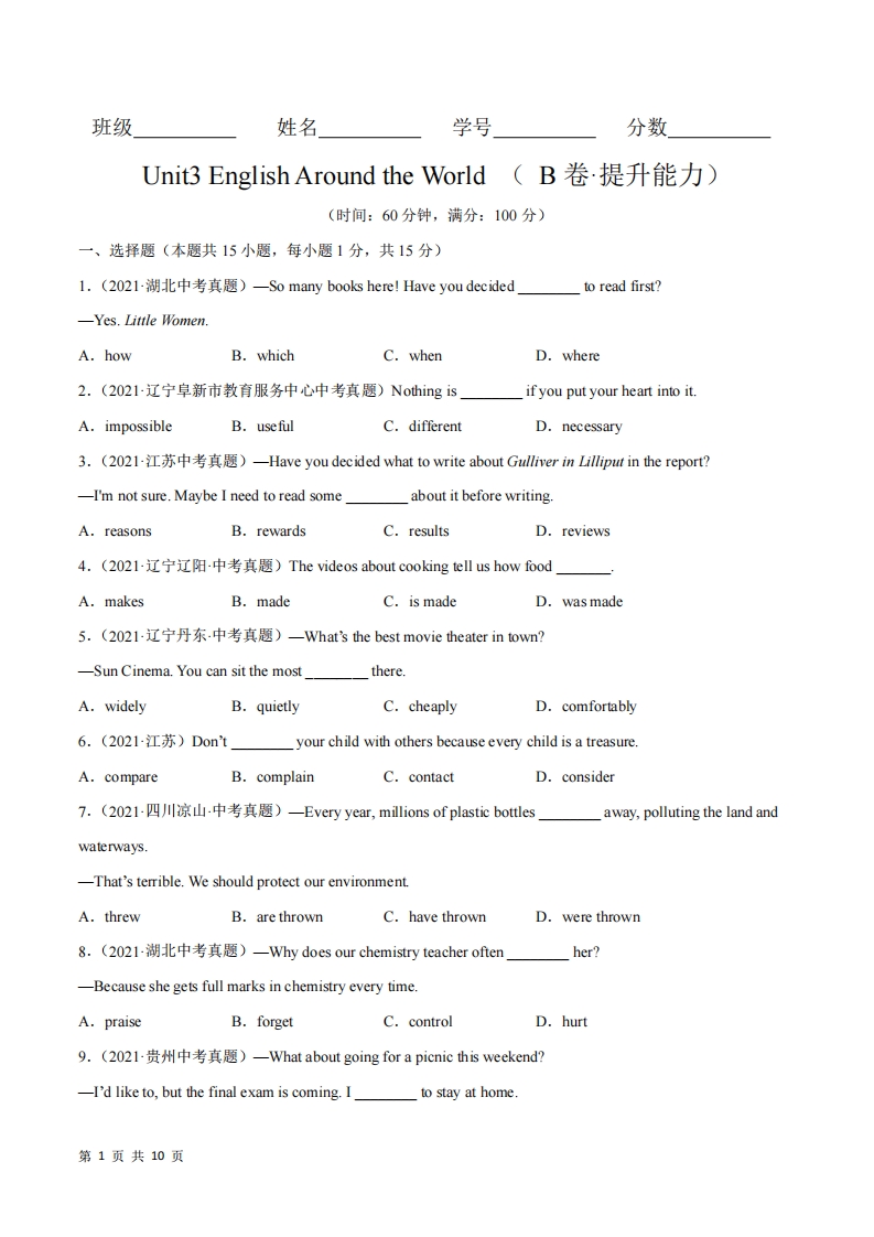 九年级(上)英语 Unit 3 B卷能力提升(仁爱版)