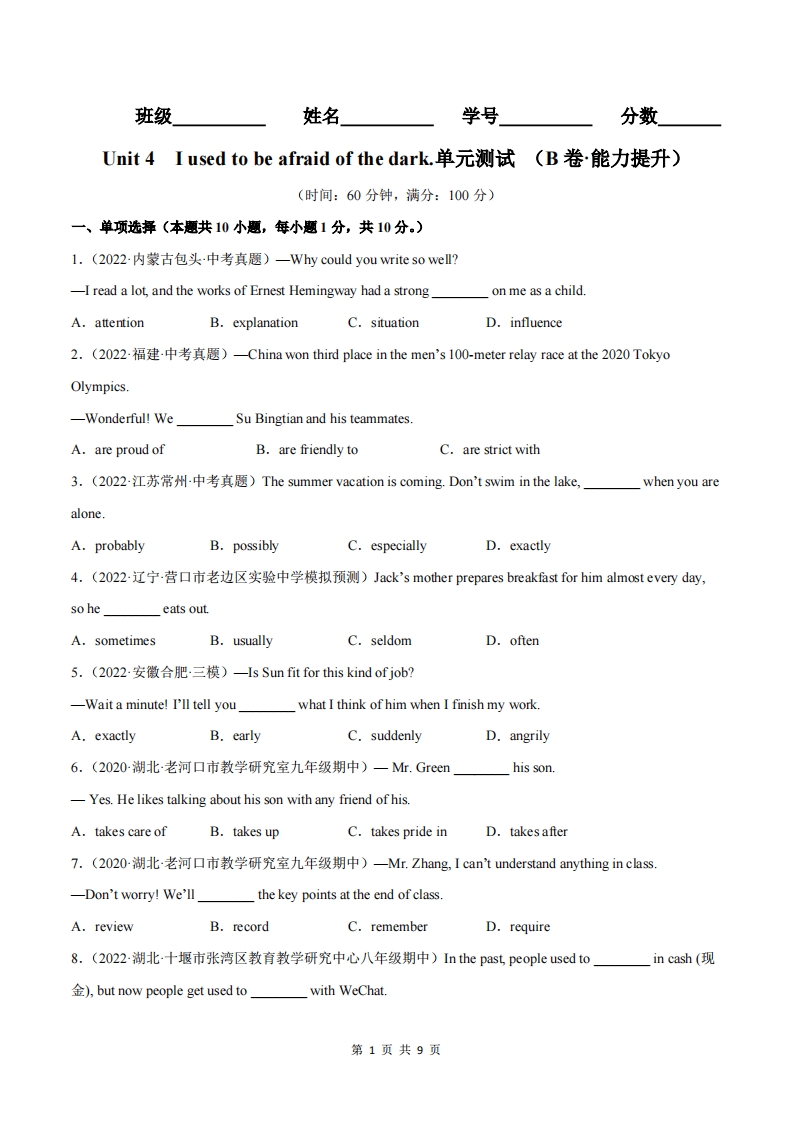 九年级(上)英语 Unit 4 B卷能力提升(人教版)