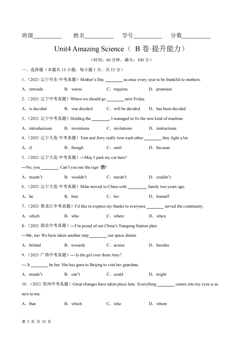 九年级(上)英语 Unit 4 B卷能力提升(仁爱版)