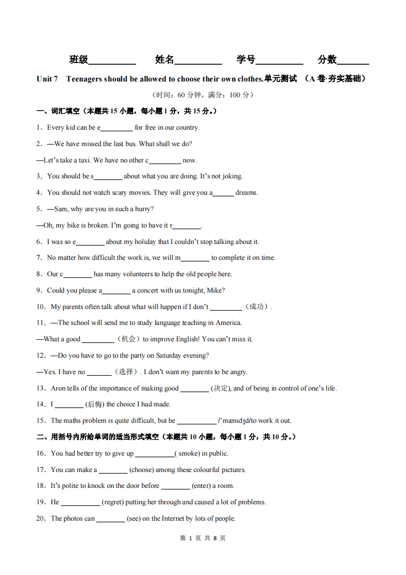 首页九年级英语上册九年级(上)英语 Unit 7 A卷夯实基础(人教版)