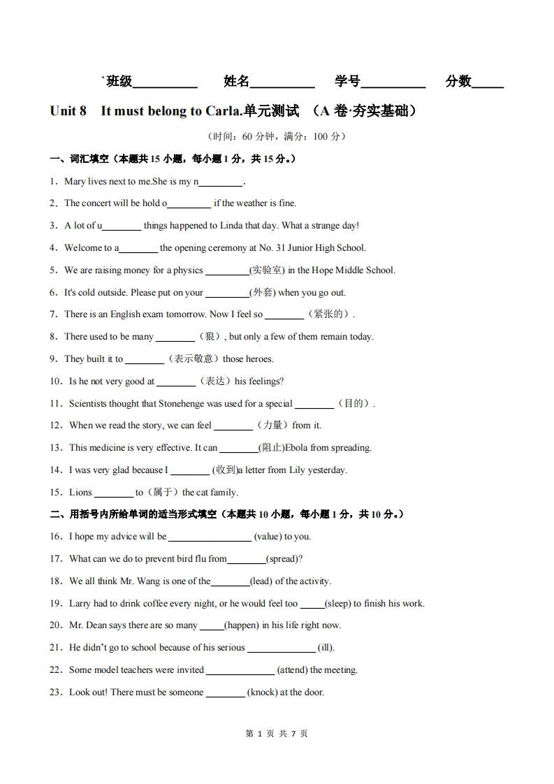 首页九年级英语上册九年级(上)英语 Unit 8 A卷夯实基础(人教版)