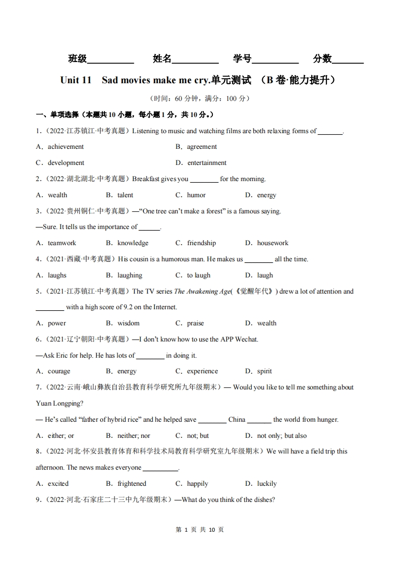 九年级(上)英语 Unit 11 B卷能力提升(人教版)