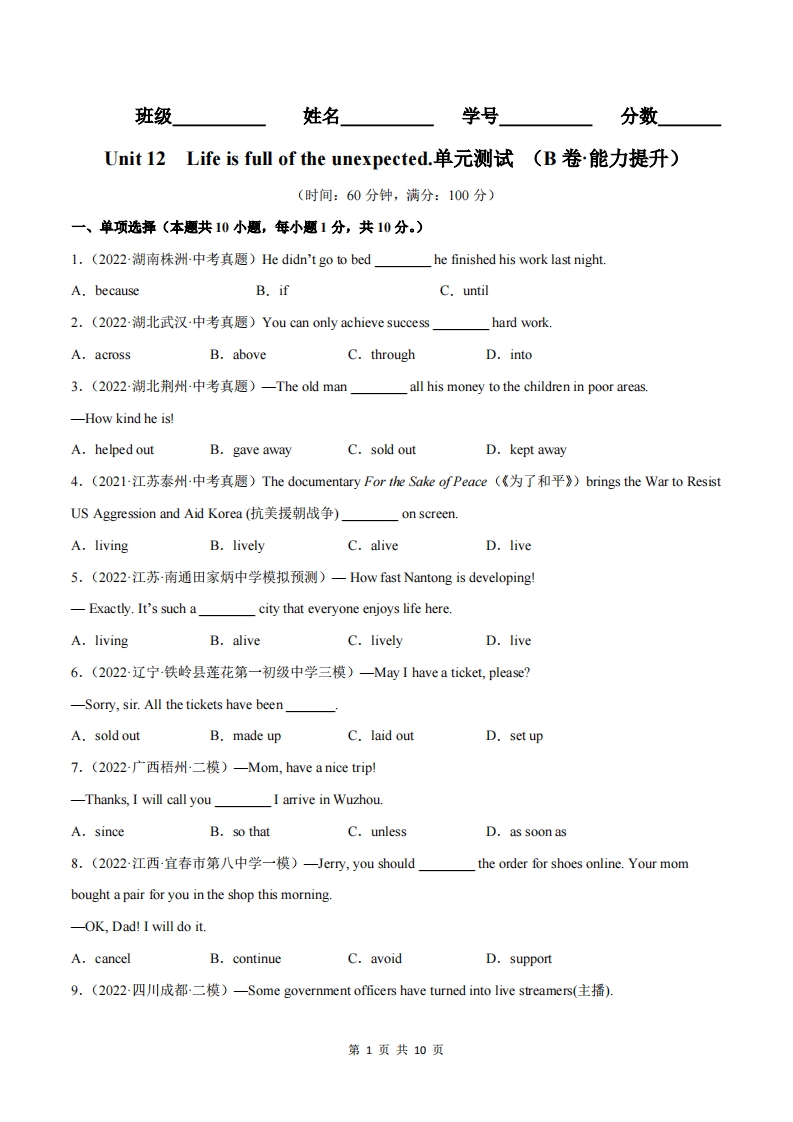 首页九年级英语上册九年级(上)英语 Unit 12 B卷夯实基础(人教版)