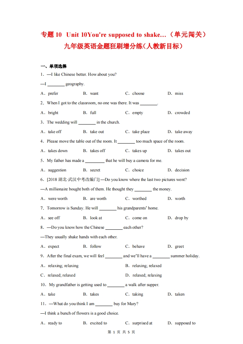 首页九年级英语上册九年级(上)英语 Unit10单元闯关(人教版)