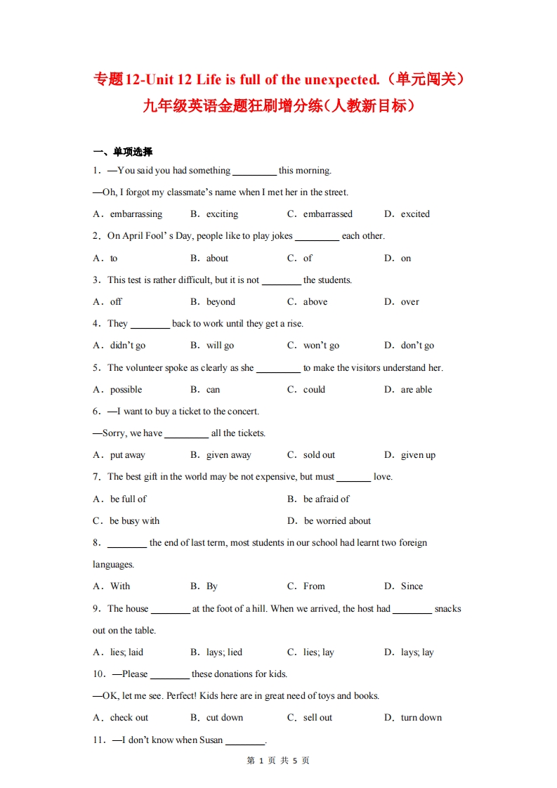 九年级(上)英语 Unit12单元闯关(人教版)