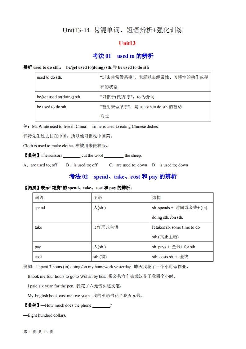 九年级(上)英语 Unit13-14易混单词 短语辨析 强化训练(人教版)