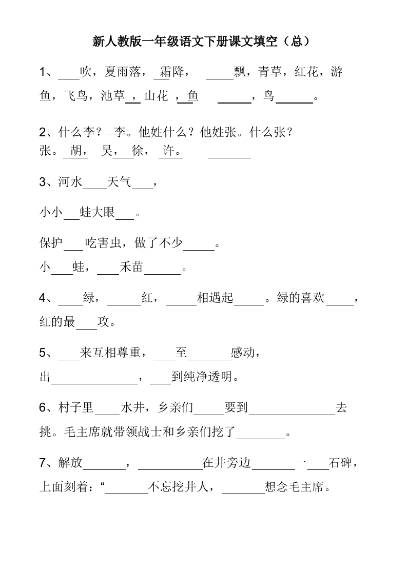 新人教版一年级语文下册课文填空