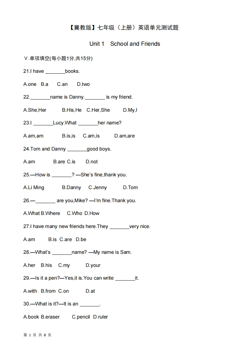 七年级(上)英语 Unit 1 单元测试(冀教版)